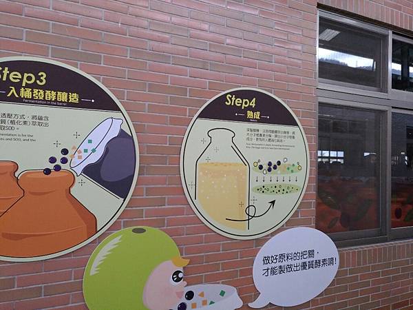 進而將各式水果和果品 來製作成果醋/陳年醋/酵素 ,而這一連串的 發酵過程可透由在歡笑故事館中有圖片 的展示讓小朋友可以更加了解