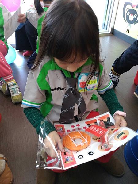 而阿白在他的姓名貼紙上有一顆小蘋果,說明著她是果果家族, 所以只要 代理店長說明那一組時,小朋友有舉手說也是同一組就可以獲得貼紙, 其實獲得貼紙相當簡易,只是小朋友真的要鼓起勇氣,千萬別害羞