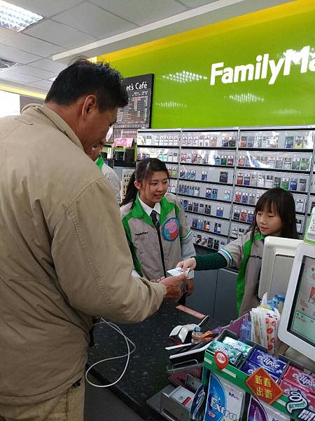 刷完條碼報上金額,就是要爸爸媽媽付錢囉 其實覺得 這類型的體驗活動最大的賣點就是爸爸媽媽會為小朋友 買東西,讓他們來結帳,這無形中也是幫便利商店增加收入