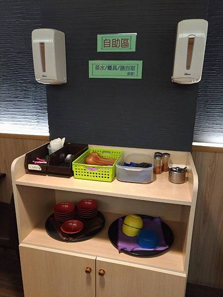 餐具等各式調味瓶都在後方, 若需要分食碗或是兒童碗是自助式的自行拿取