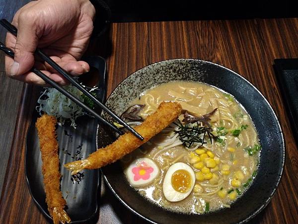 長濱拉麵的湯頭喝起來為有點帶著醬香及味噌風味,所以算是 風味相當多層次的拉麵款,而炸蝦的部分是屬於長型沒有裹上過多的麵粉,讓人感覺相當的實在