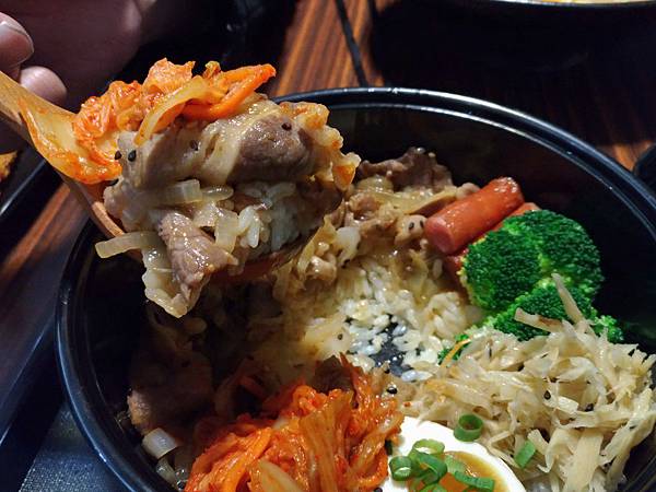 牛肉片碳烤過後,加上拌飯及泡菜